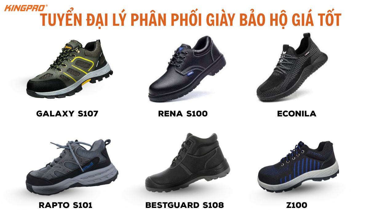 Giày bảo hộ KingPro: đạt chuẩn EN ISO 20345:2022 và ASTM F2413:2018, có các dòng nổi bật như Z100 thể thao nhẹ thoáng, BestGuard da thật cổ cao, S101 RAPTO đế cao su chịu nhiệt, S102 TITAN ủng bảo hộ chống dầu – axit, cùng các mẫu ECONILA, VENUS, URBAN phù hợp môi trường nhẹ.